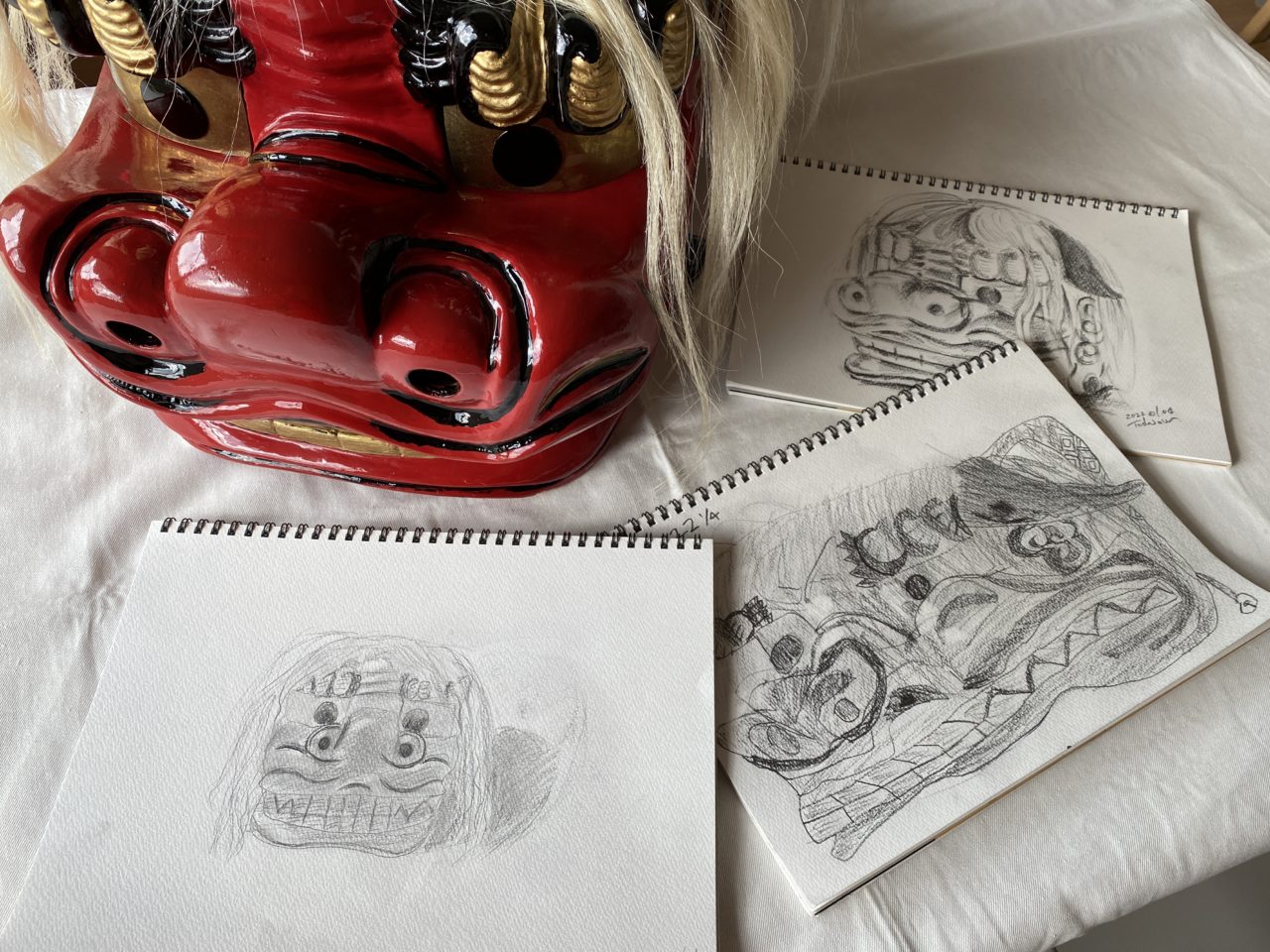 岡山で小学生と一緒に鉛筆デッサン(獅子頭)