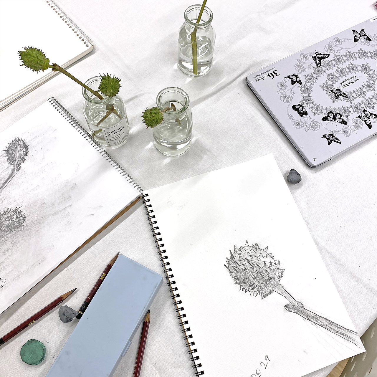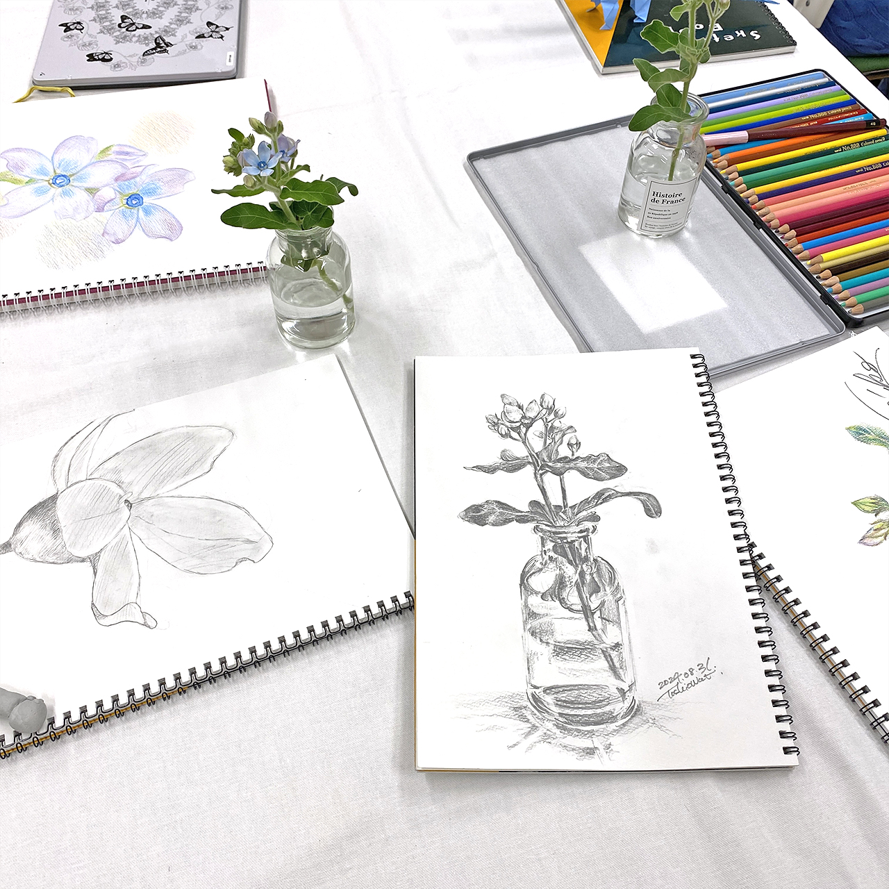 フルーツやお花など身近なモチーフで、講師に教えてもらいながらスケッチブックにデッサンをします。デッサンの後は無添加おやつを皆で頂くことで、おやつを通して食の大切さや体への影響などを学ぶ時間となっています。