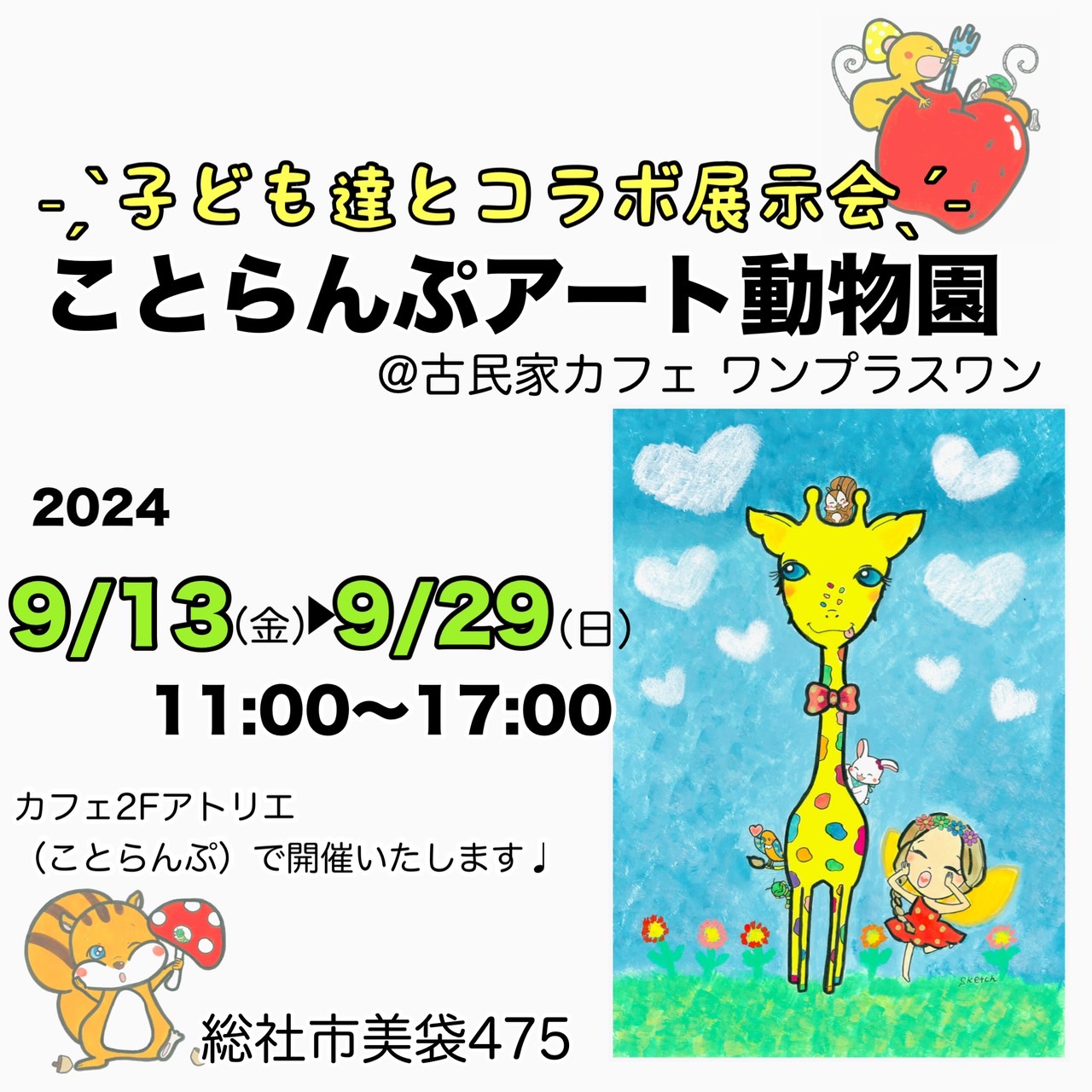岡山県総社市美袋にある古民家カフェ ワンプラスワンのスタッフで笑顔絵イラスト作家の中川ゆりかさんが主体となって開催されるアートイベント第3回『ことらんぷアート動物園』が開催されます ※ワンプラスワン様は2013年4月からお仕事でご縁ができました。