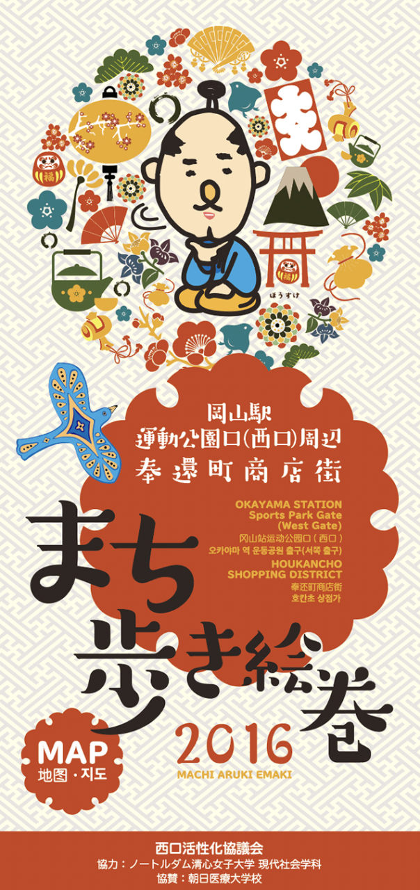 まず初めに紹介するのはこの『まち歩きMAP』です 2015年からDieodeDesignが制作担当させていただいております 初回は全ての店舗をバードビューのイラストで描いたり 侍キャラクターの”ほうすけ”をご提案させていただいたりしました
