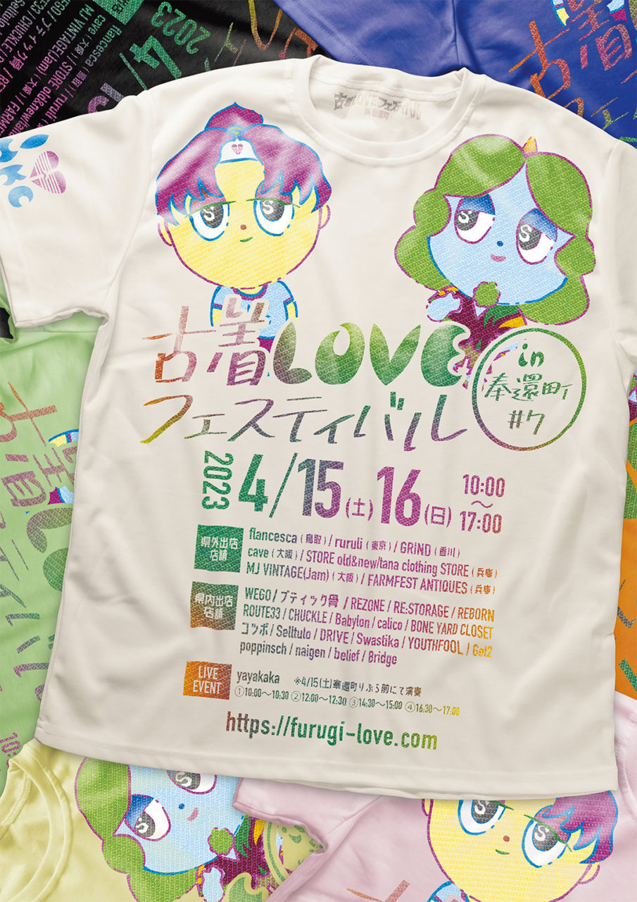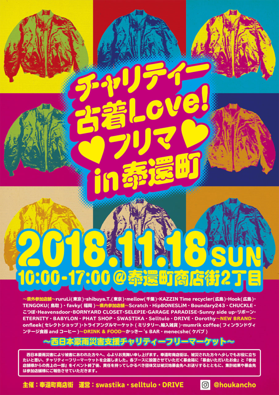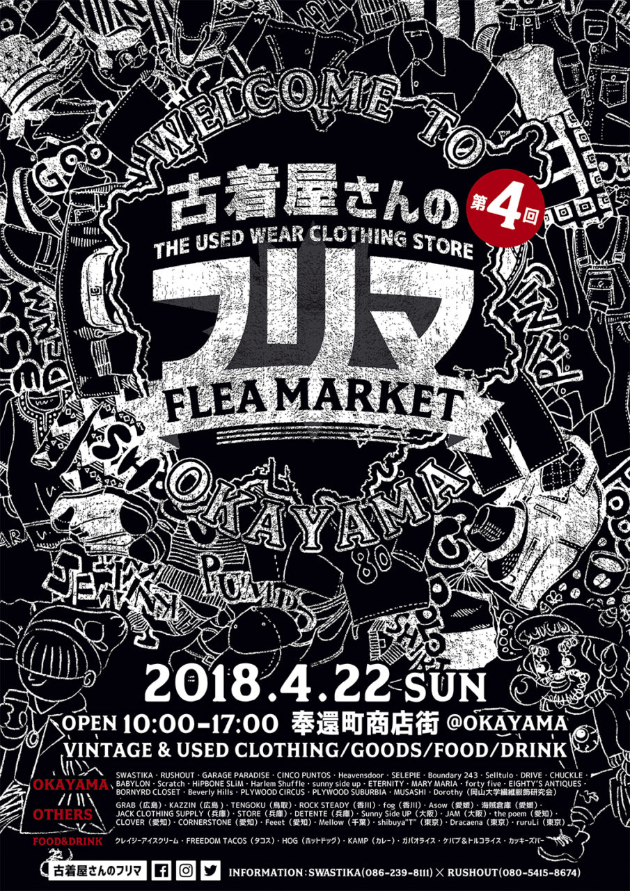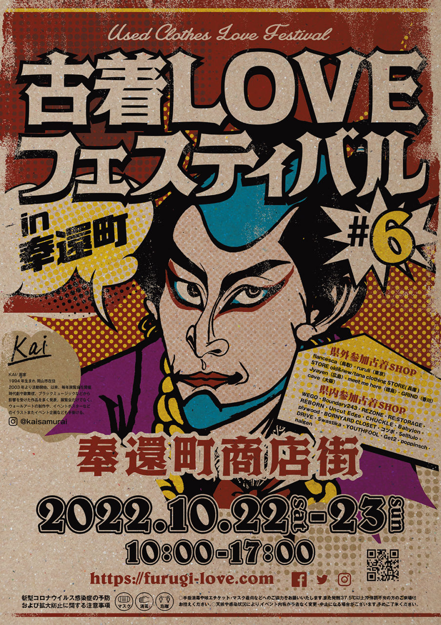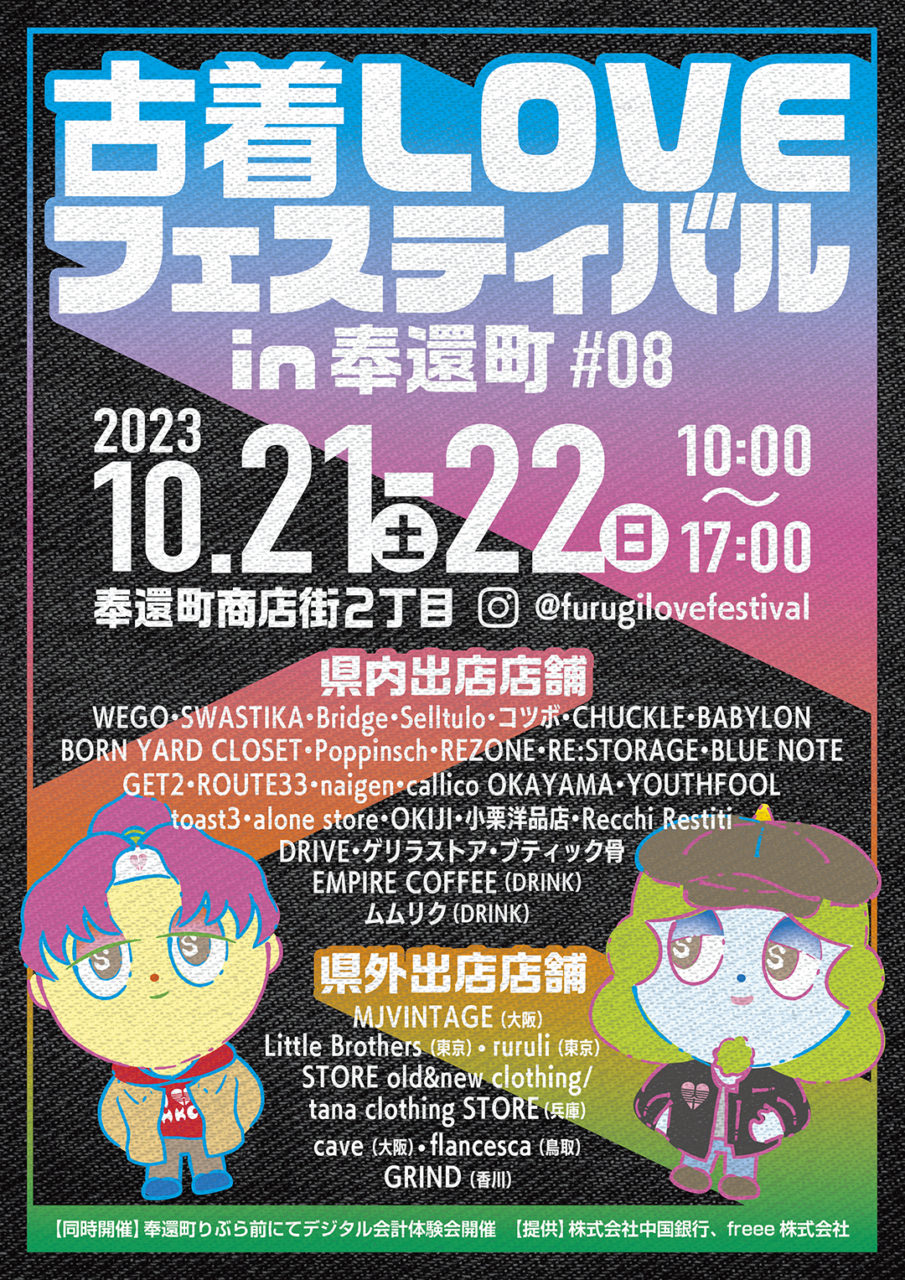 奉還町商店街を代表するイベントになりました 年に2回 春と秋に開催される 商店街にある古着屋さんの主催イベント 県外から参加される店舗もあり商店街が若い人で埋め尽くされます こちらは前身イベント『古着屋さんのフリマ(2016)』の時から各種印刷物を担当しています