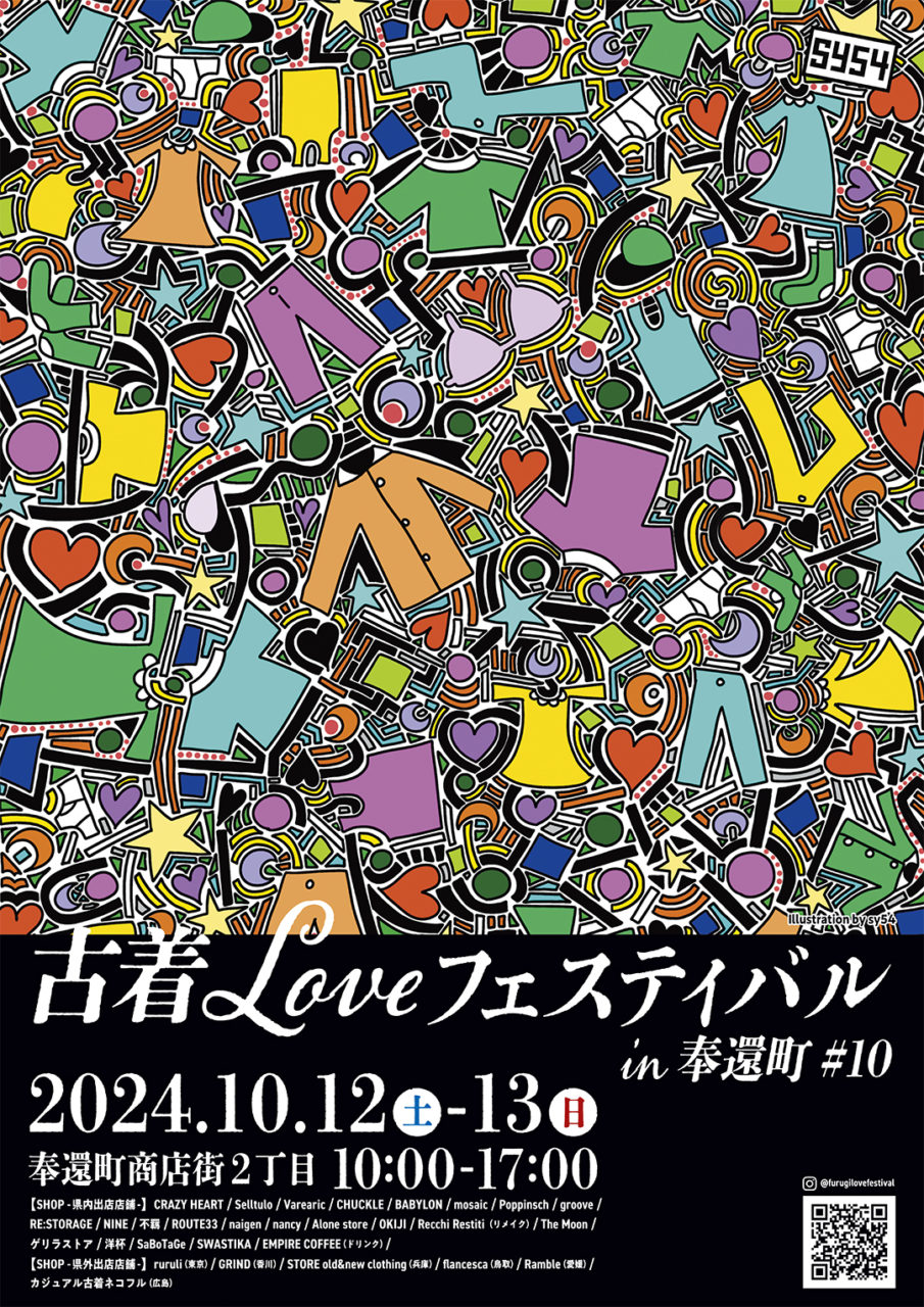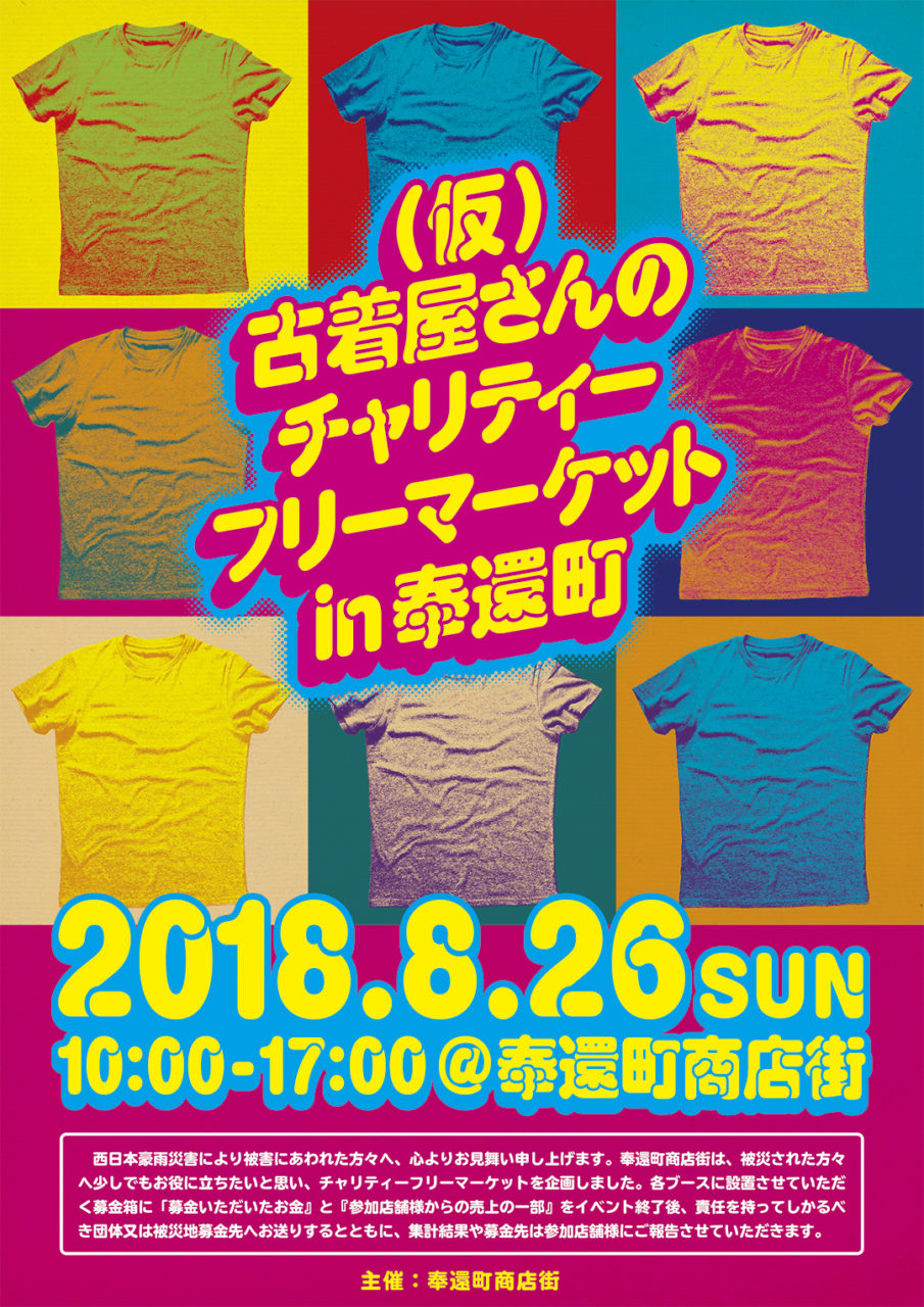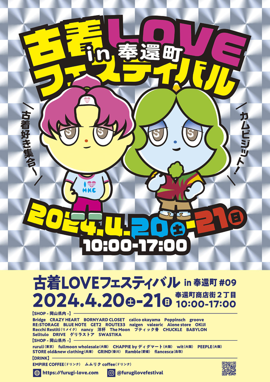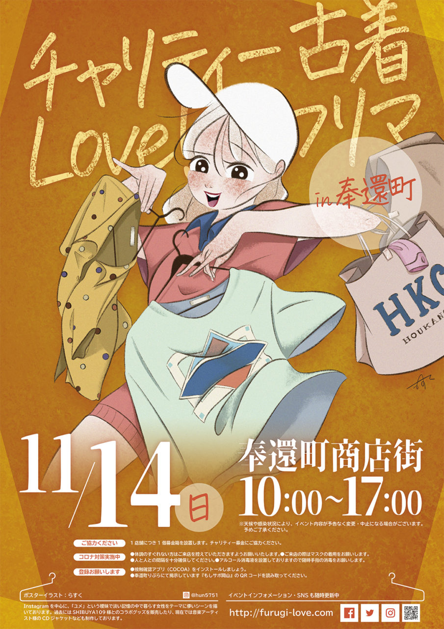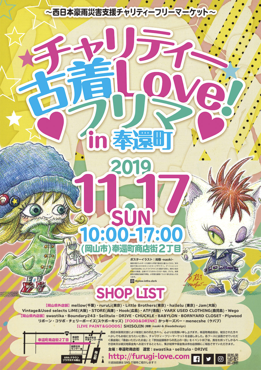 奉還町商店街を代表するイベントになりました 年に2回 春と秋に開催される 商店街にある古着屋さんの主催イベント 県外から参加される店舗もあり商店街が若い人で埋め尽くされます こちらは前身イベント『古着屋さんのフリマ(2016)』の時から各種印刷物を担当しています