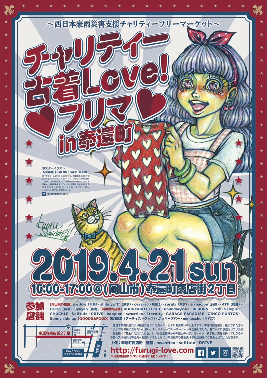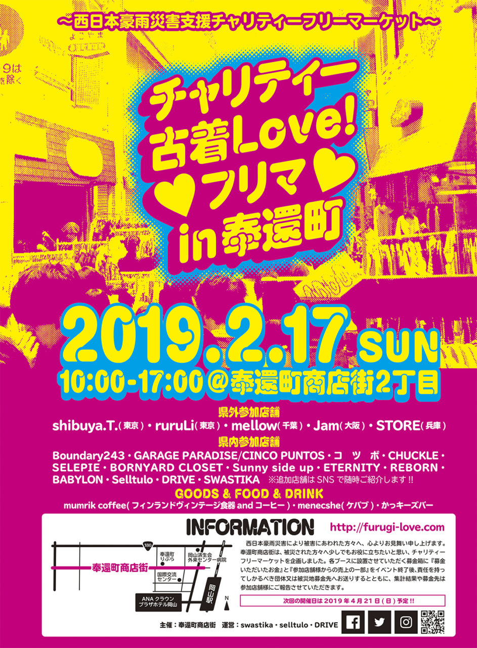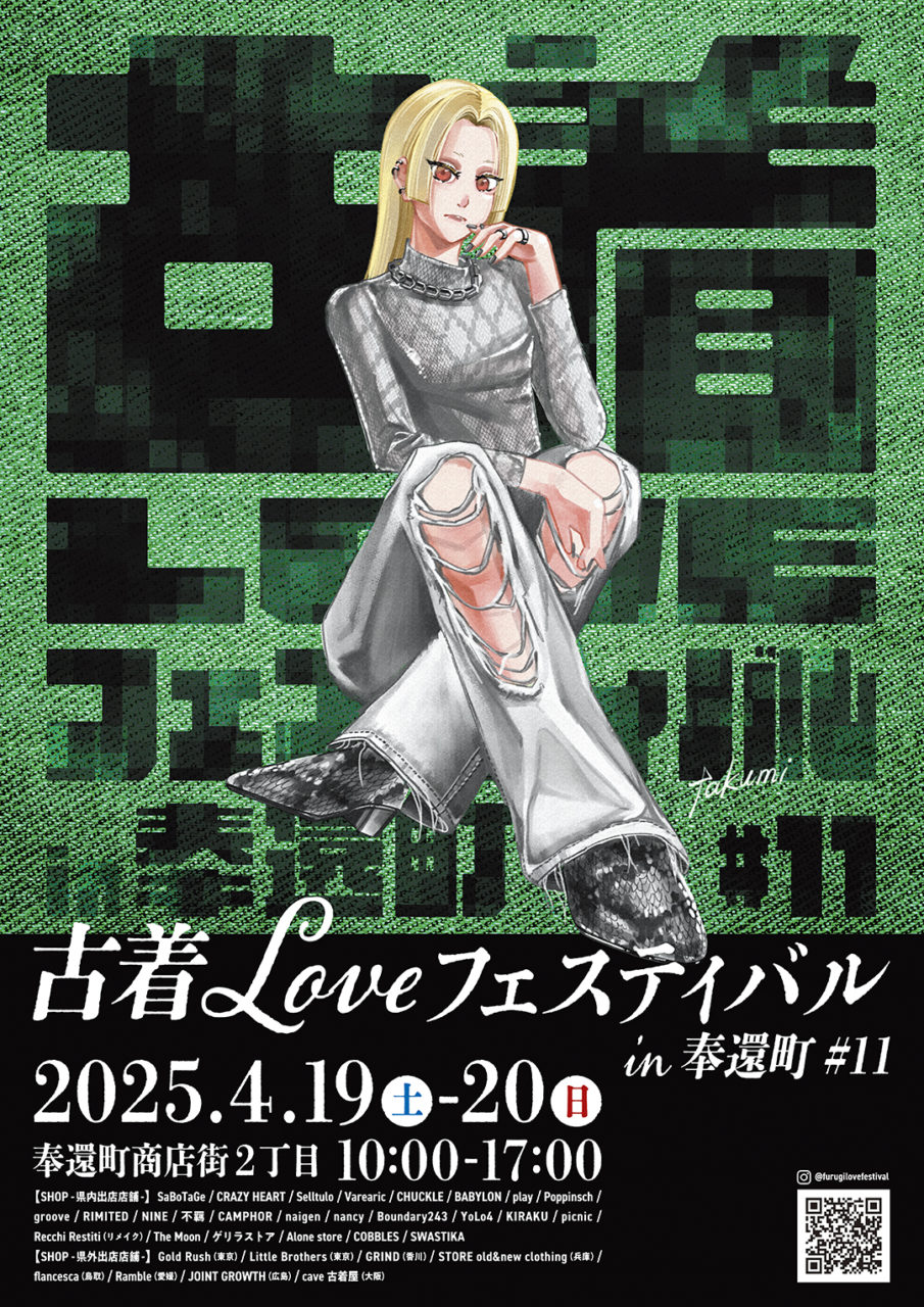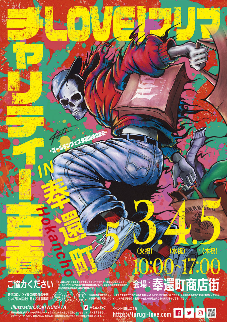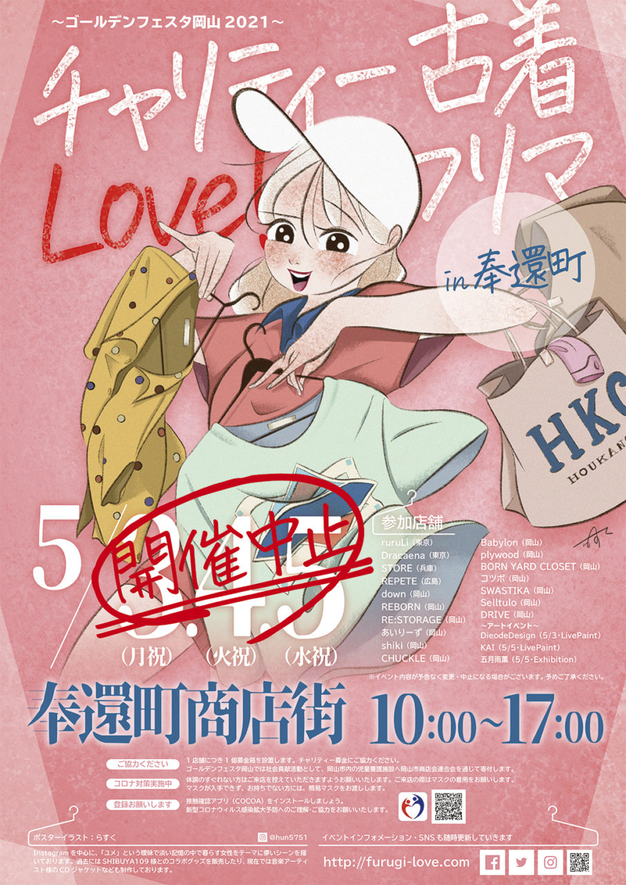 奉還町商店街を代表するイベントになりました 年に2回 春と秋に開催される 商店街にある古着屋さんの主催イベント 県外から参加される店舗もあり商店街が若い人で埋め尽くされます こちらは前身イベント『古着屋さんのフリマ(2016)』の時から各種印刷物を担当しています