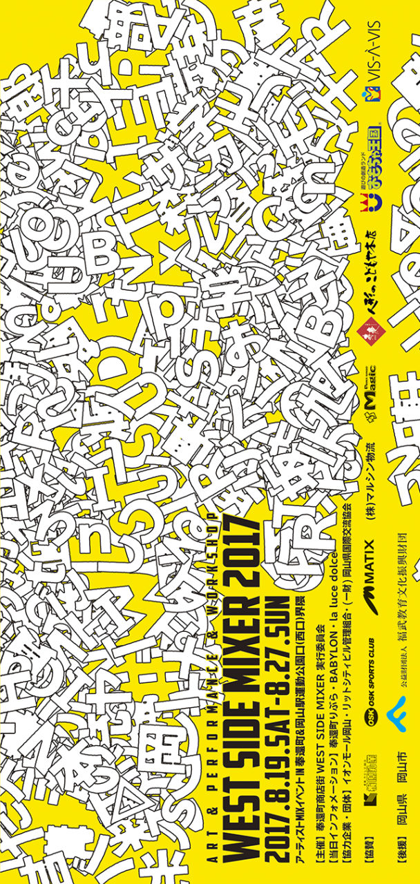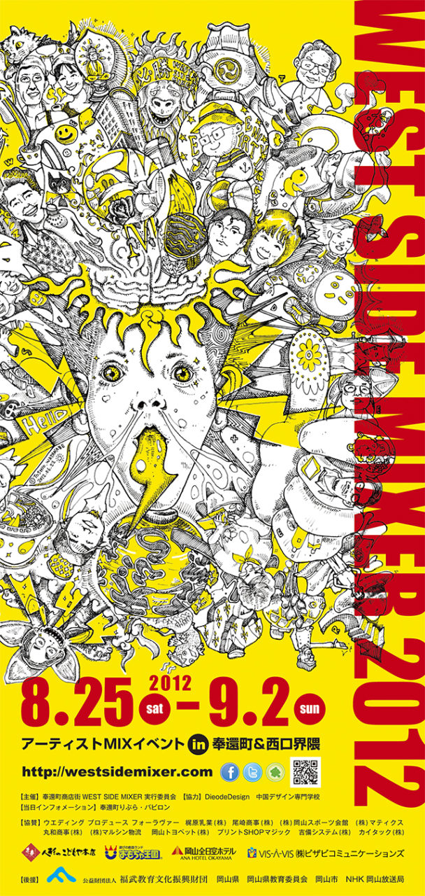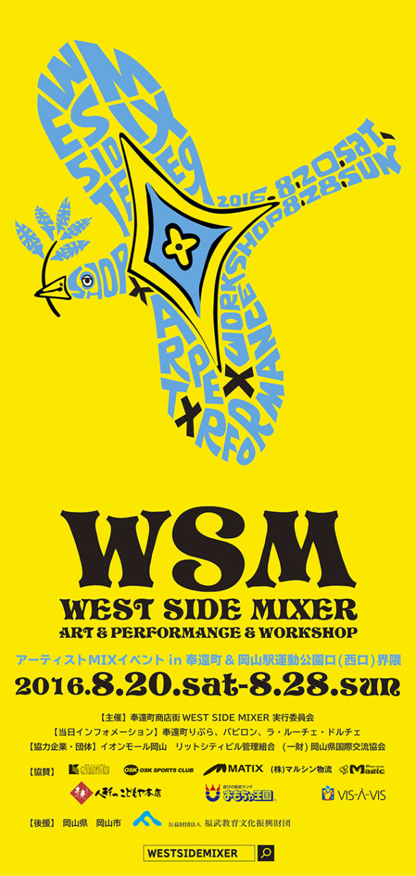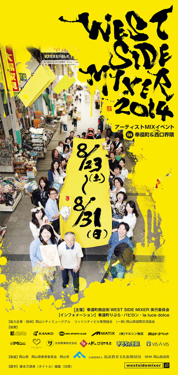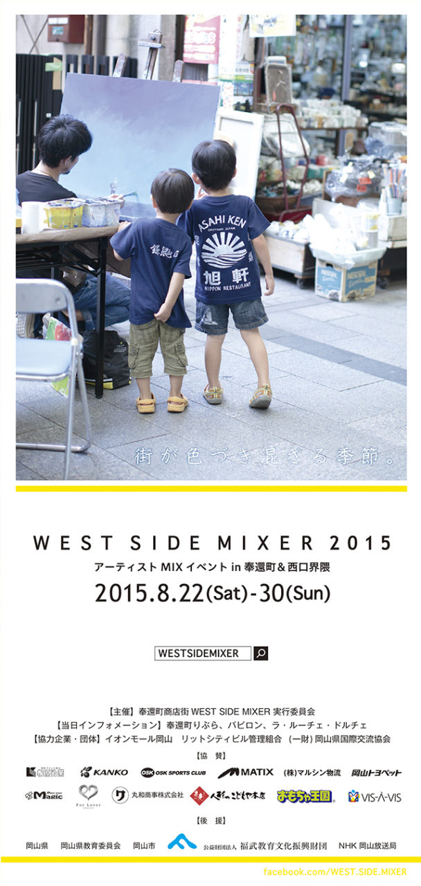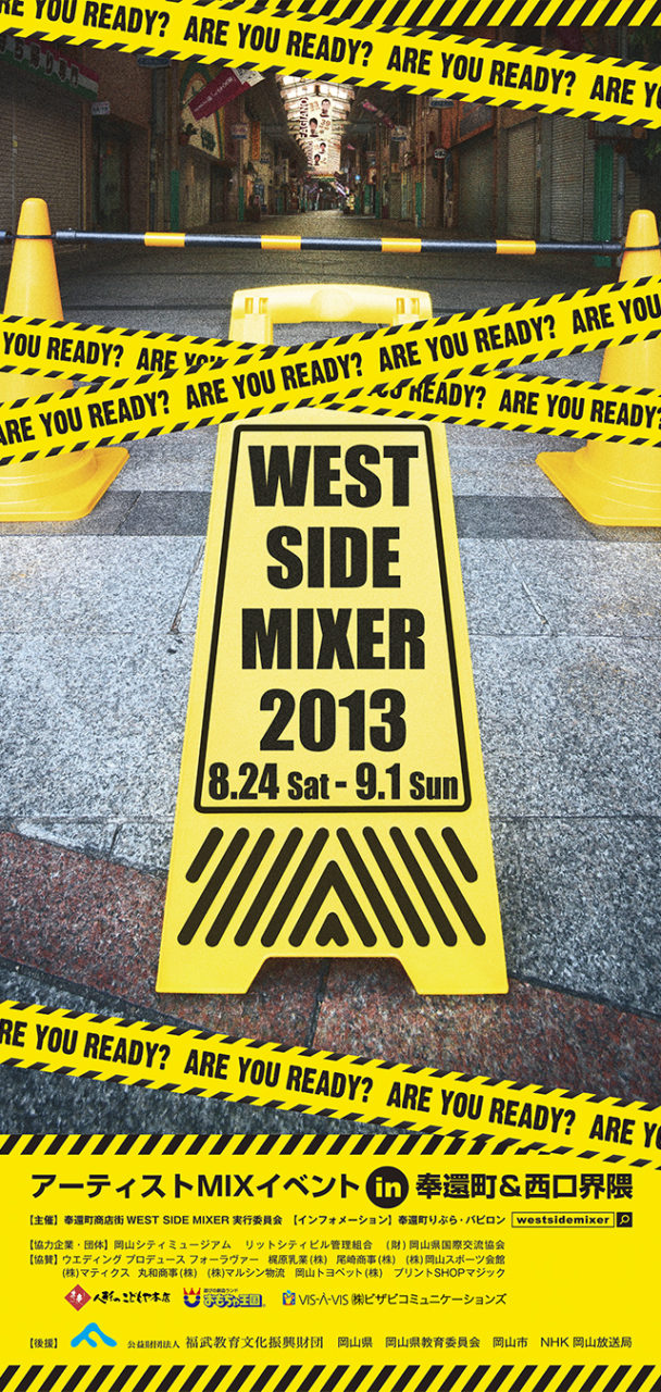 WEST SIDE MIXERとは 奉還町商店街内の店舗とアーティストがコラボして お店の雰囲気に合った作品を展示するアートイベントでした 2009年から2018年まで10回開催されました DieodeDesignは2012年からイベントに参加しながら実行委員として 各種印刷物を担当しました