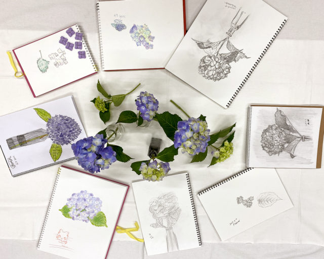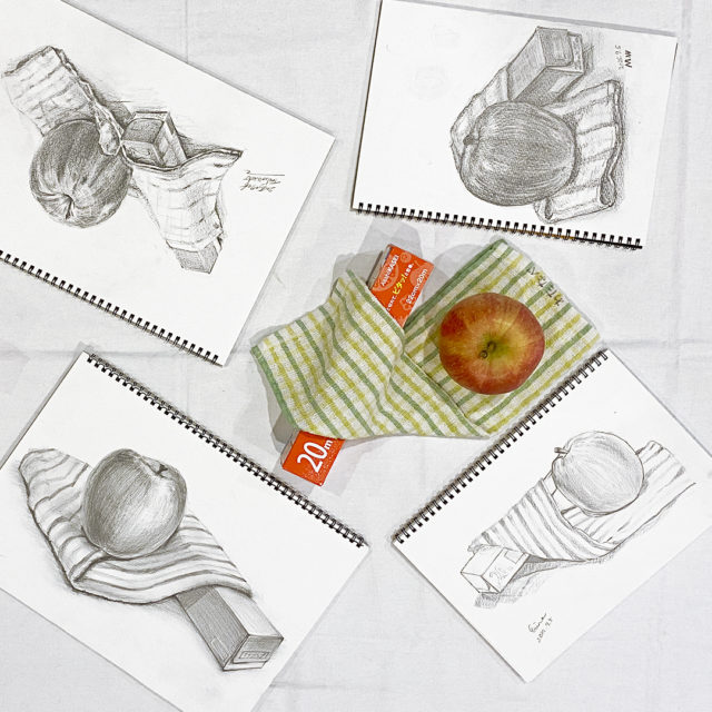 フルーツやお花など身近なモチーフで、講師に教えてもらいながらスケッチブックにデッサンをします。デッサンの後は無添加おやつを皆で頂くことで、おやつを通して食の大切さや体への影響などを学ぶ時間となっています。