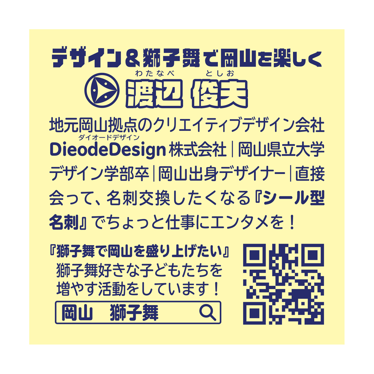 岡山出身デザイナー|岡山県立大学デザイン学部卒|岡山県立岡山芳泉高等学校卒|代表 渡辺俊夫|ロゴマーク・キャラクター・イラスト・グッズ制作から各種印刷物まで|備前一宮 桃太郎獅子 舞手