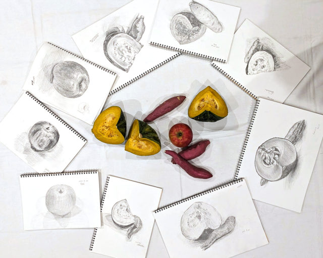 フルーツやお花など身近なモチーフで、講師に教えてもらいながらスケッチブックにデッサンをします。デッサンの後は無添加おやつを皆で頂くことで、おやつを通して食の大切さや体への影響などを学ぶ時間となっています。